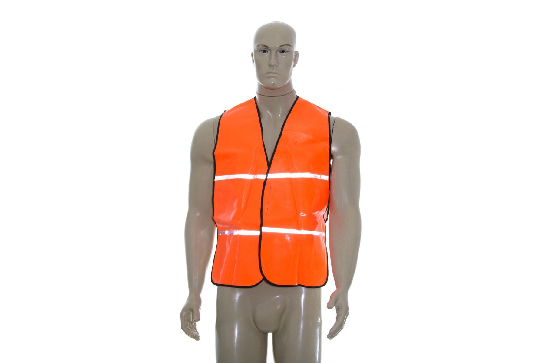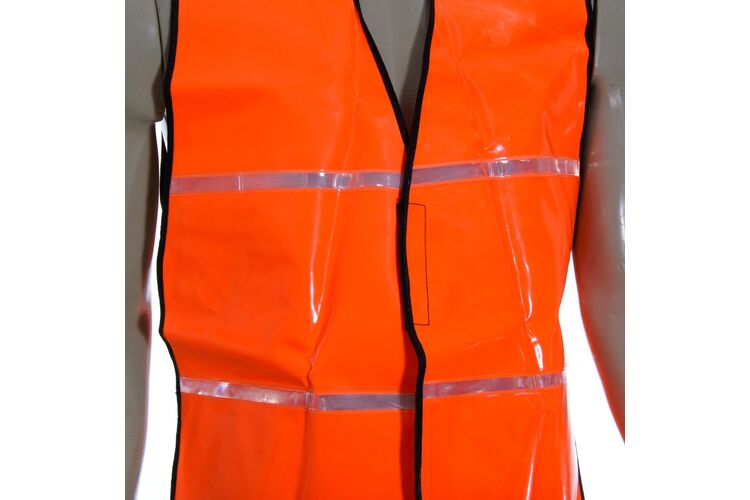 Colete de sinalização de alta visibilidade, sem bolso. Confeccionado em PVC, combinado com faixas refletivas, fechamento frontal em Velcro.