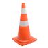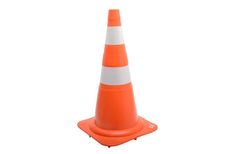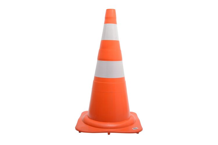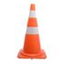 Cone modelo NBR15071 para sinalização e segurança viária injetado em PVC na cor laranja, com duas faixas refletivas na cor branca.