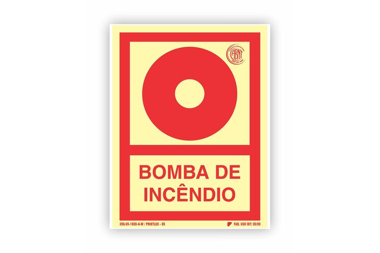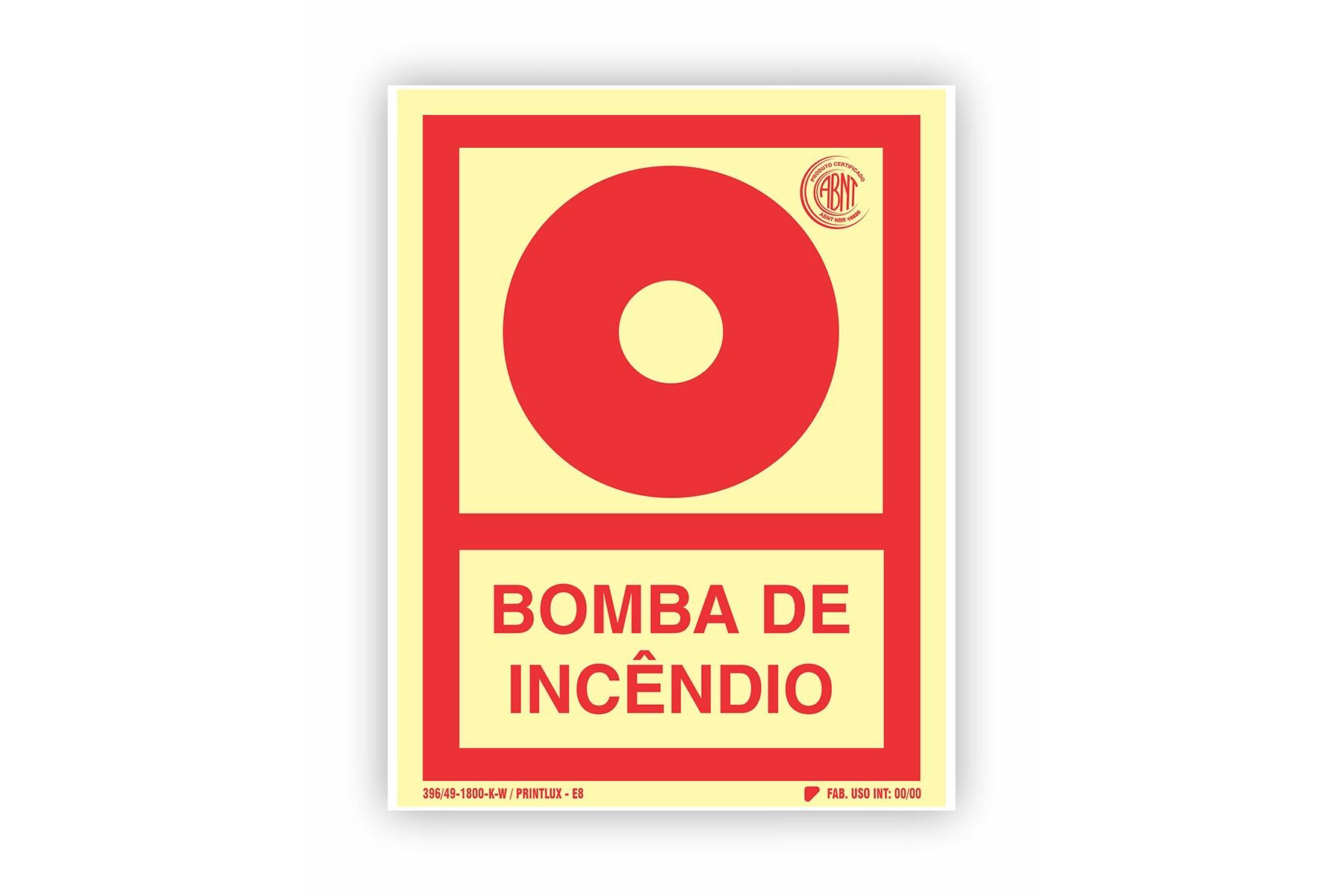 Placa de Sinalização E3 BOMBA DE INCÊNDIO, confeccionada em PVC expandido 2mm, fotoluminescente, Impressão por processo de Silk Screen. Tamanho 10 x 15