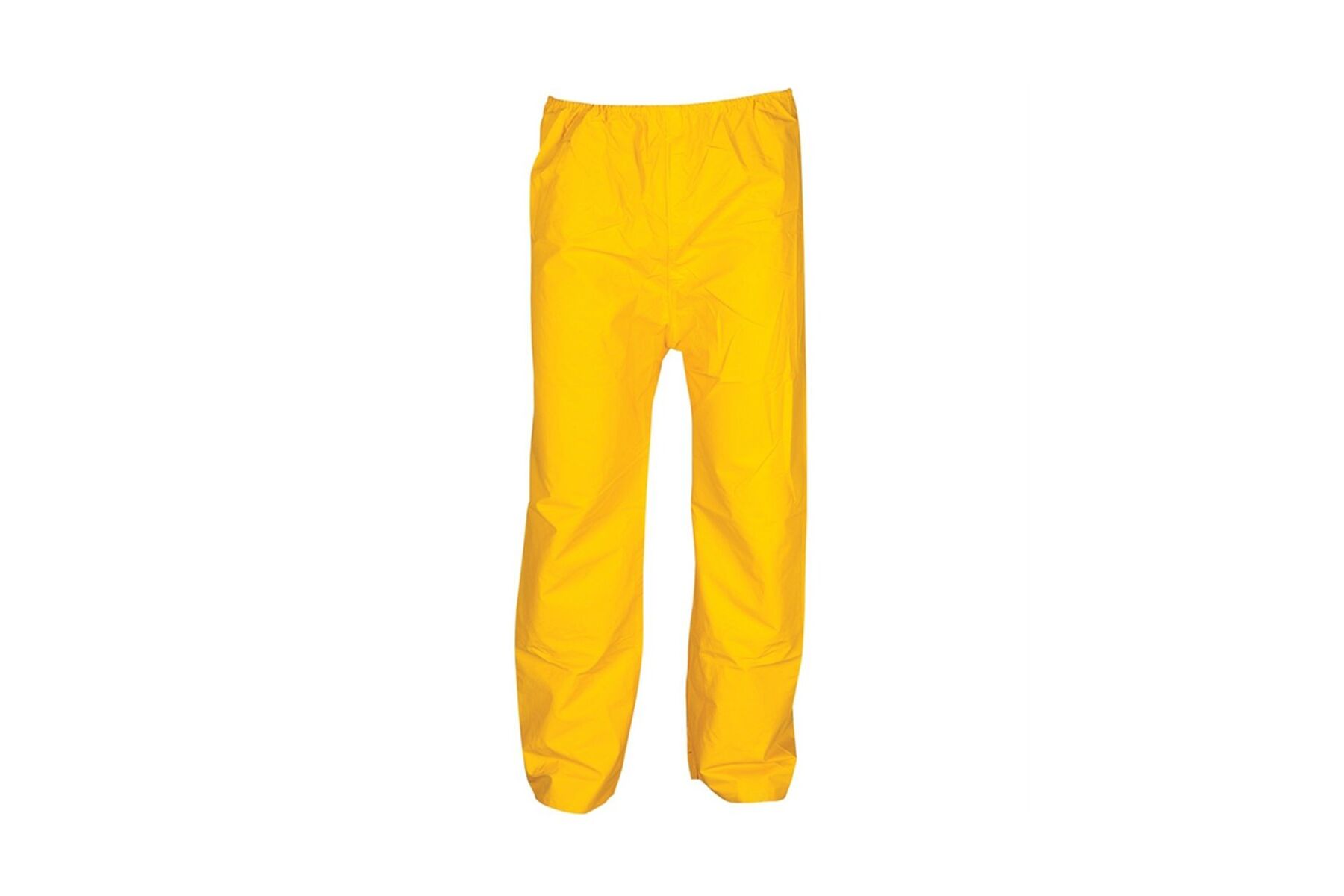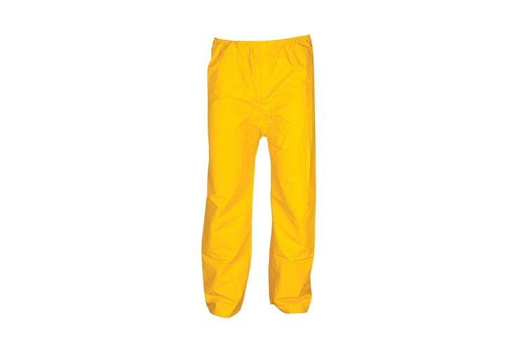 Calça de segurança, tipo pijama, confeccionada em tecido de poliéster plastificado com PVC em uma das faces, com cordão na cintura para ajustes e costura por meio de solda eletrônica. Certificado de Aprovação: 28482