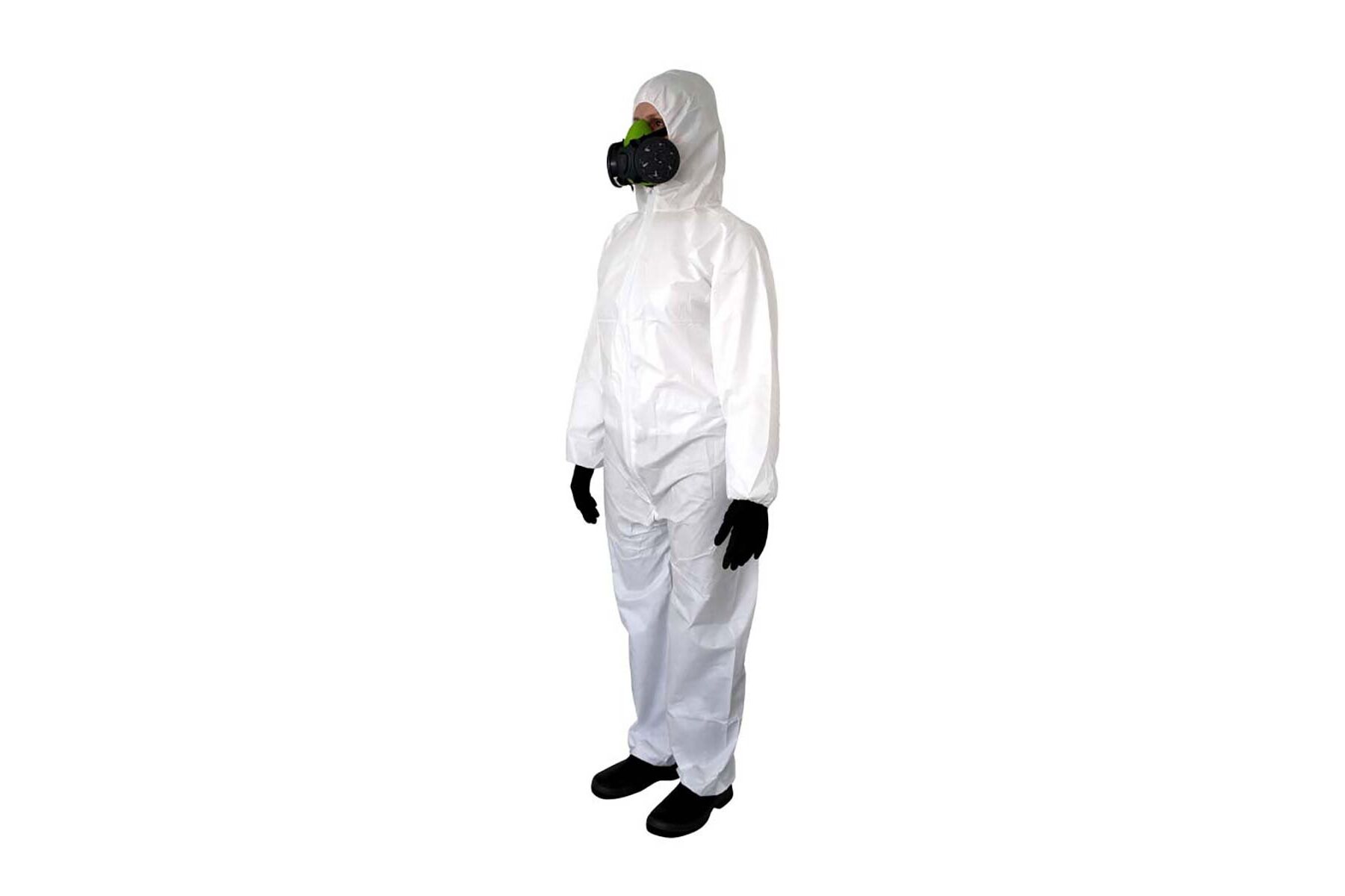 Macacão de segurança confeccionado em tecido não tecido (TNT) de polipropileno com filme de polietileno microporoso, capuz de duas peças com elástico, fechamento frontal com zíper bidirecional sem aba protetora, elástico na cintura, punhos e tornozelos. Certificado de Aprovação: 39183