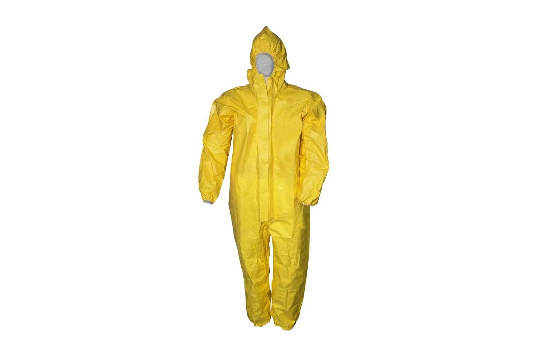 Macacão de segurança confeccionado em tecido não tecido (TNT) de polipropileno com uma camada laminada de polietileno, capuz de três peças com elástico, f6echamento frontal com zíper bidirecional e aba protetora, elástico no punho para ajuste no dedo polegar, costuras seladas, elástico na cintura, punhos e tornozelos. Certificado de Aprovação: 39182