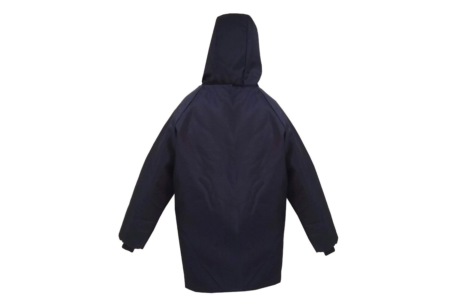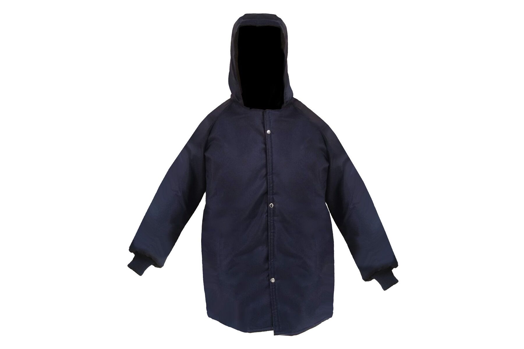 Japona de segurança confeccionada em náilon, forro em manta acrílica de matelassê, mangas longas, punho em malha, capuz, fechamento em velcro e três botões de pressão metálicos. Certificado de Aprovação: 10975 Comprimento:90cm: Largura:66cm: Manga:79cm.