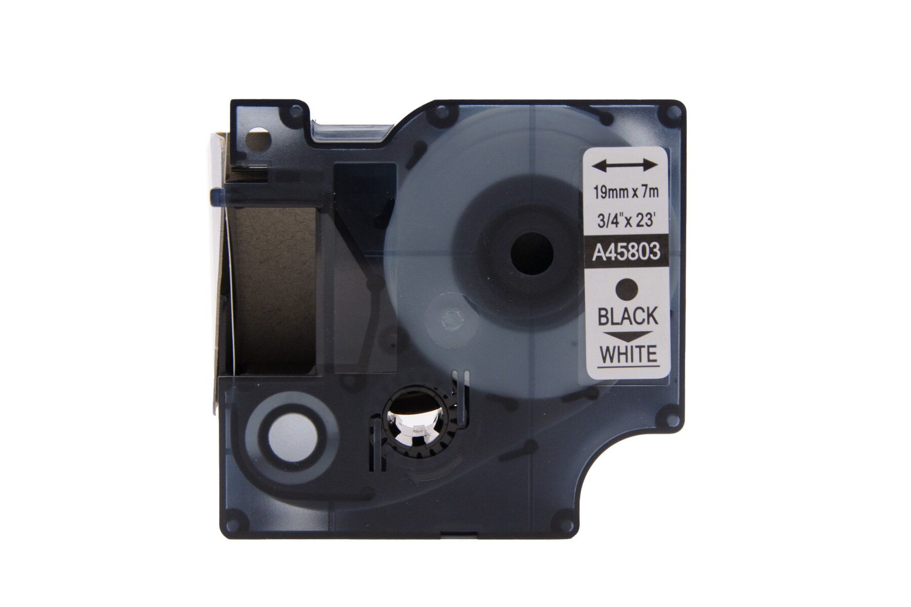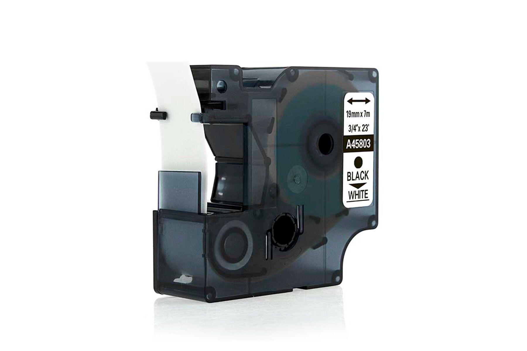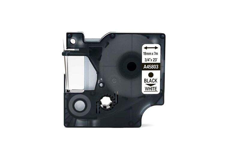 Fita/Refil em poliéster, referência A45803. dimensões 19mm x 7 metros. Para utilização na linha de rotuladores eletrônicos profissionais DYMO. Fácil de colocar ou trocar. Fiota na cor branca e texto na cor preta. Resistente a umidade, conserva o brilho das cores. Permite ser aplicada em praticamente todas as superfícies desde que limpas e secas. Resistente a temperaturas -30º até 130º, exposição ultravioleta, umidade, óleos e alguns solventes. As etiquetas de Poliéster proporcionam ótima qualidade, e aderem a praticamente todas a superfícies lisas e planas. Especificações: Compatíveis com os seguintes modelos de rotuladores: POCKET/1000PLUS/LM120/LM150/LM160/LP250/LM210/LM220/LP300/LP350/LM350/LM420/LM-PNP / LabelWriter Duo.