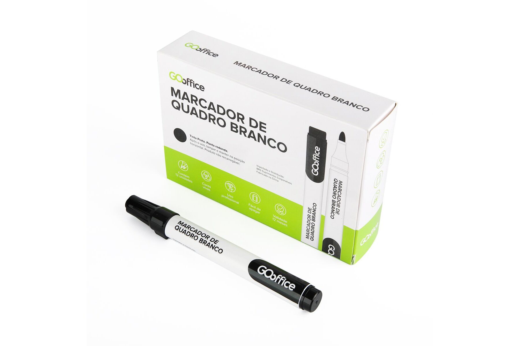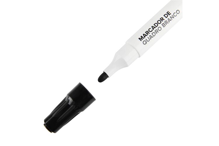 Marcador de Quadro Branco • Cor Preta • Ponta redonda 3mm • Tamanho: 14,6 x 1,6cm • Facilmente apagável • Tinta de alta qualidade e atóxica, com secagem rápida • Cores vivas
