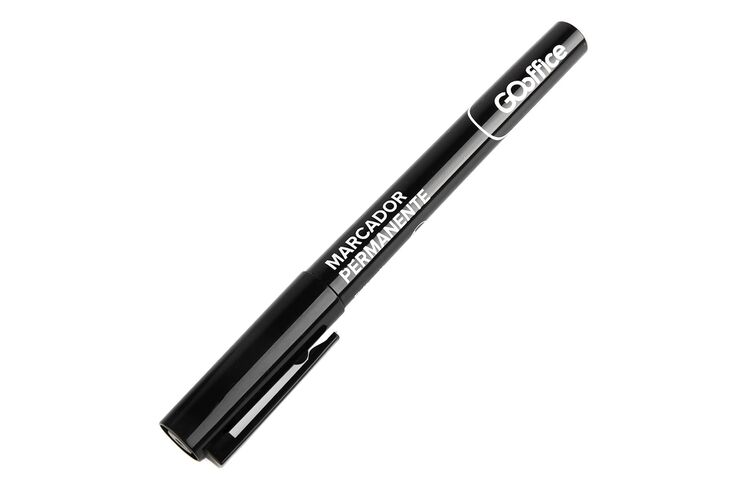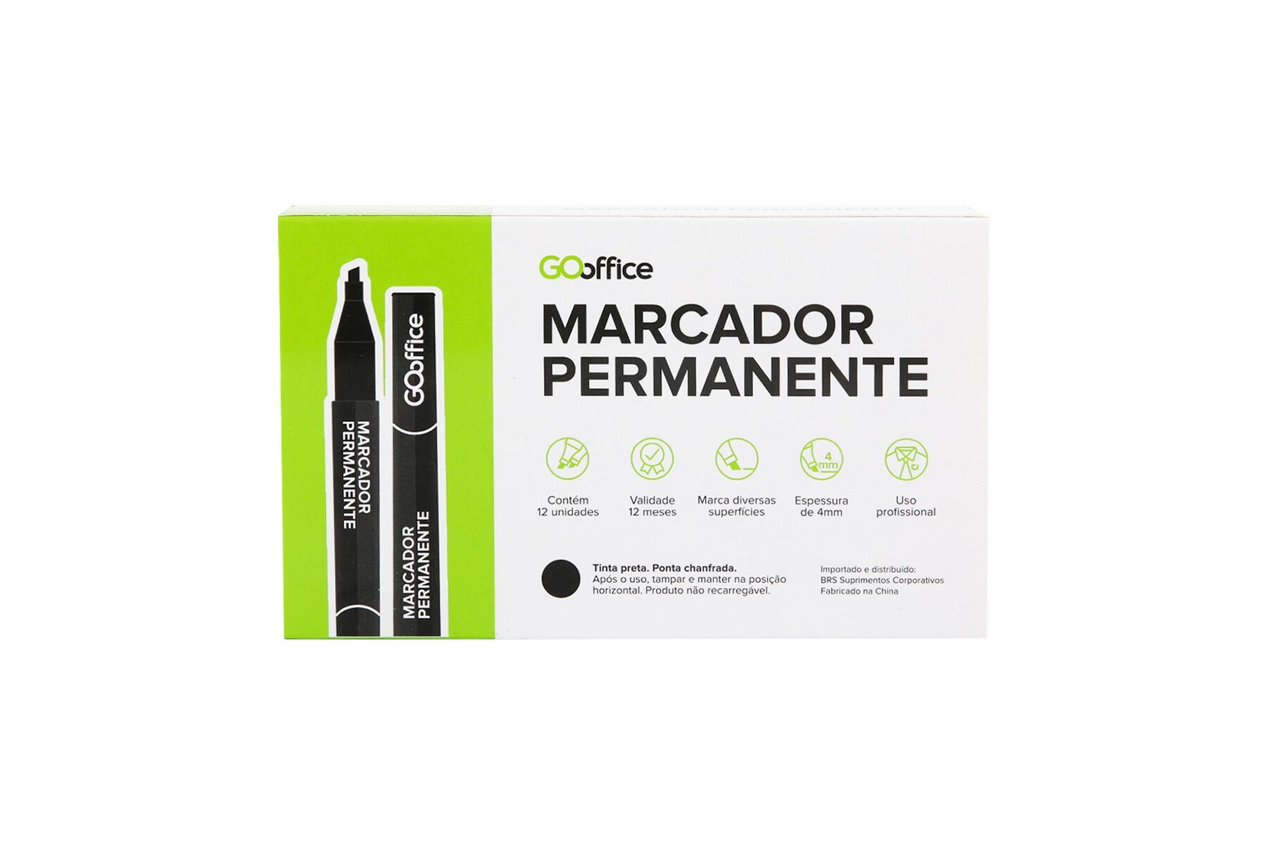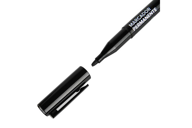 Marcador Permanente • Cor: Preta • Ponta chanfrada: 4mm • Tamanho: 13,5 x 1,1cm • Ponta: Fibra