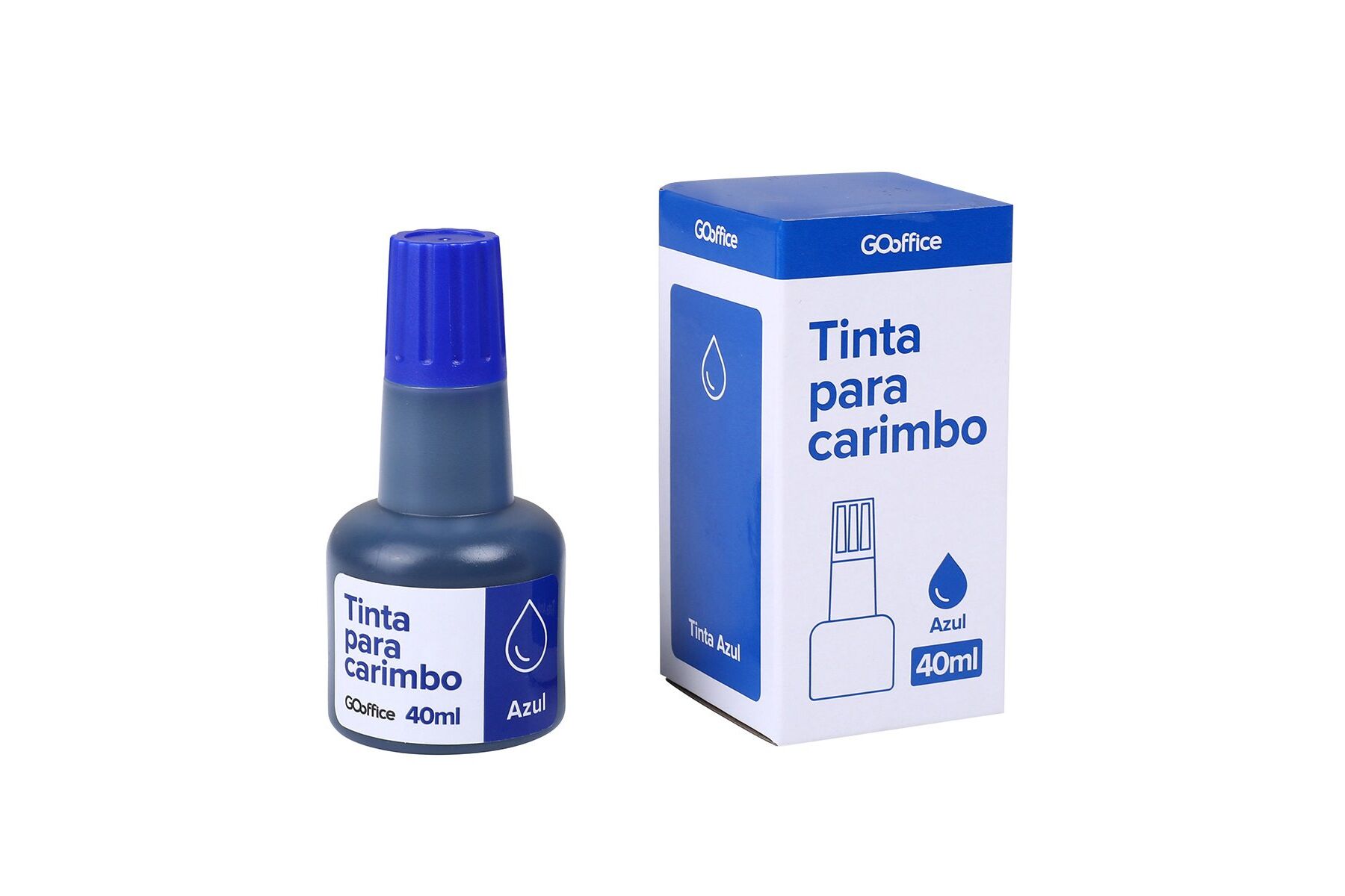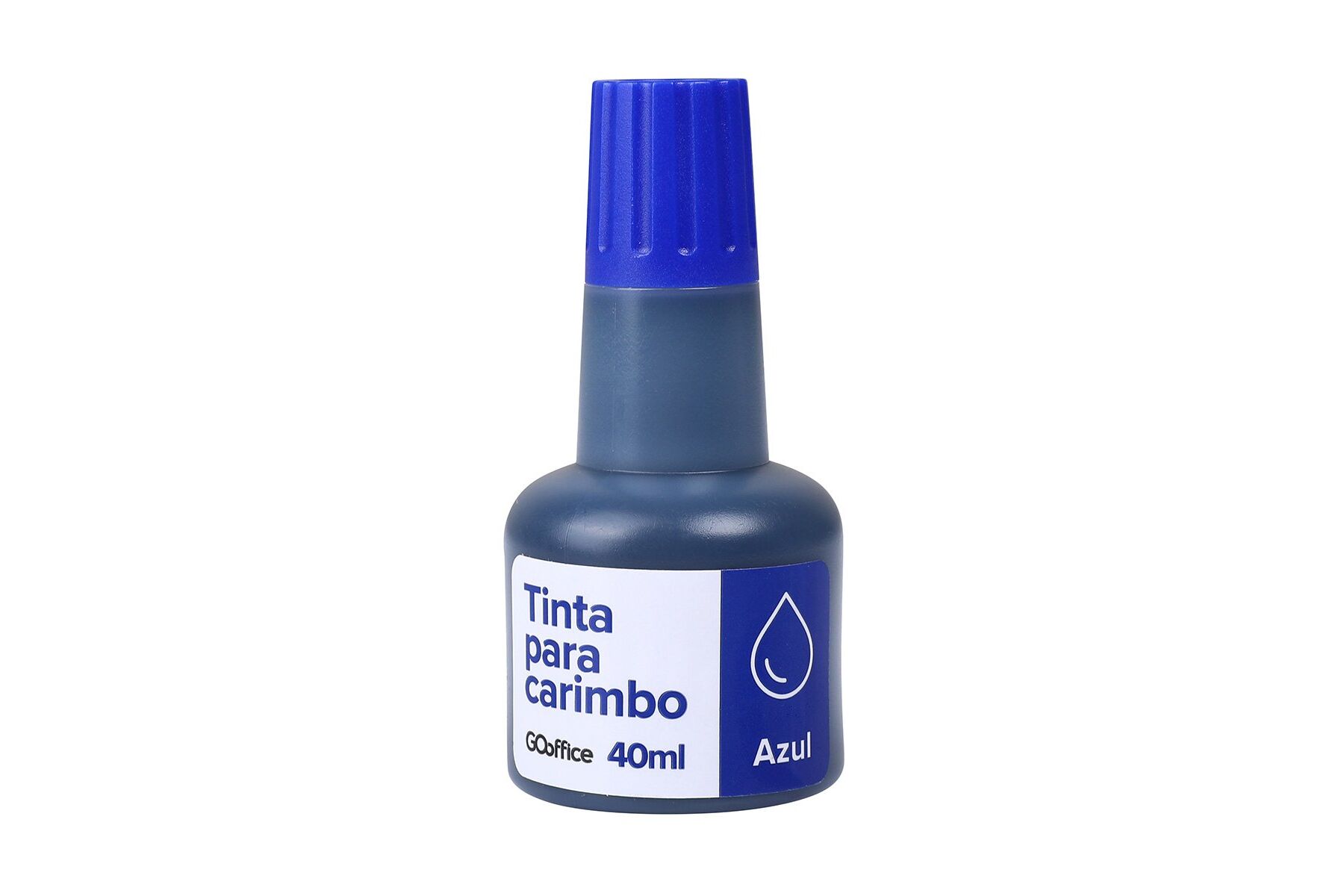 Tinta para carimbo Go Office, utilizada para reativar o funcionamento da almofada com apenas algumas gotas. Especificações: Cor: Azul: Contém: 40ml: Composição: Água, glicerina e corantes.