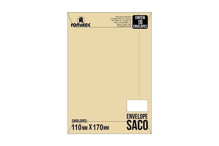 O envelope saco é ideal para correspondências, currículos e armazenamento de documentos, protegendo de poeiras e ações do tempo. É uma ótima opção para auxiliar na organização e arquivamento de documentos. Especificações Técnicas: Dimensões: 110x170mm Gramatura: 75g Cor: Kraft Natural Embalagem: Pacote com 10 unidades