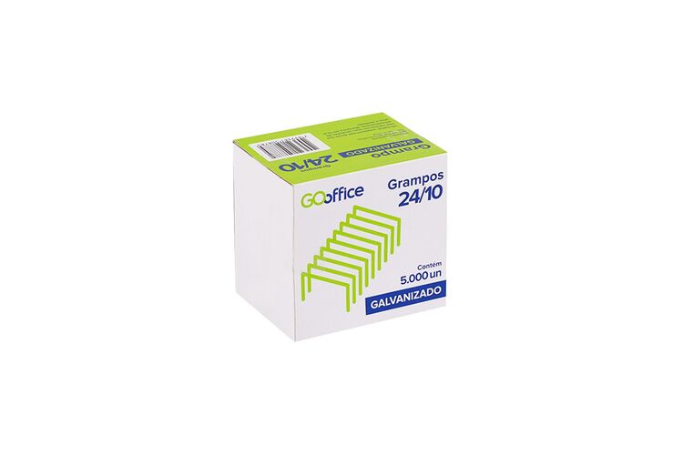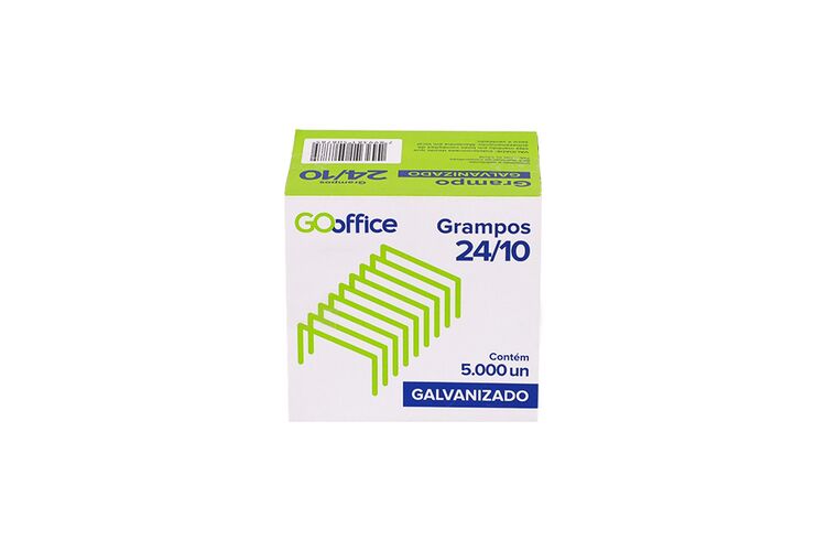 Composição: Aço galvanizado.Tamanho: 24/10. Embalagem: Caixa com 5.000 grampos. Contém tratamento galvanizado, resistente à ferrugem.