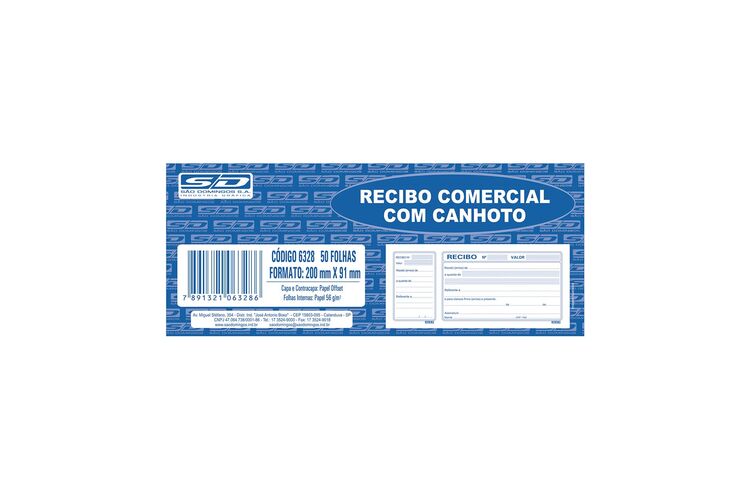 Especificação: Recibo comercial com canhoto Bloco com 50 Folhas Formato: 200mmX91mm