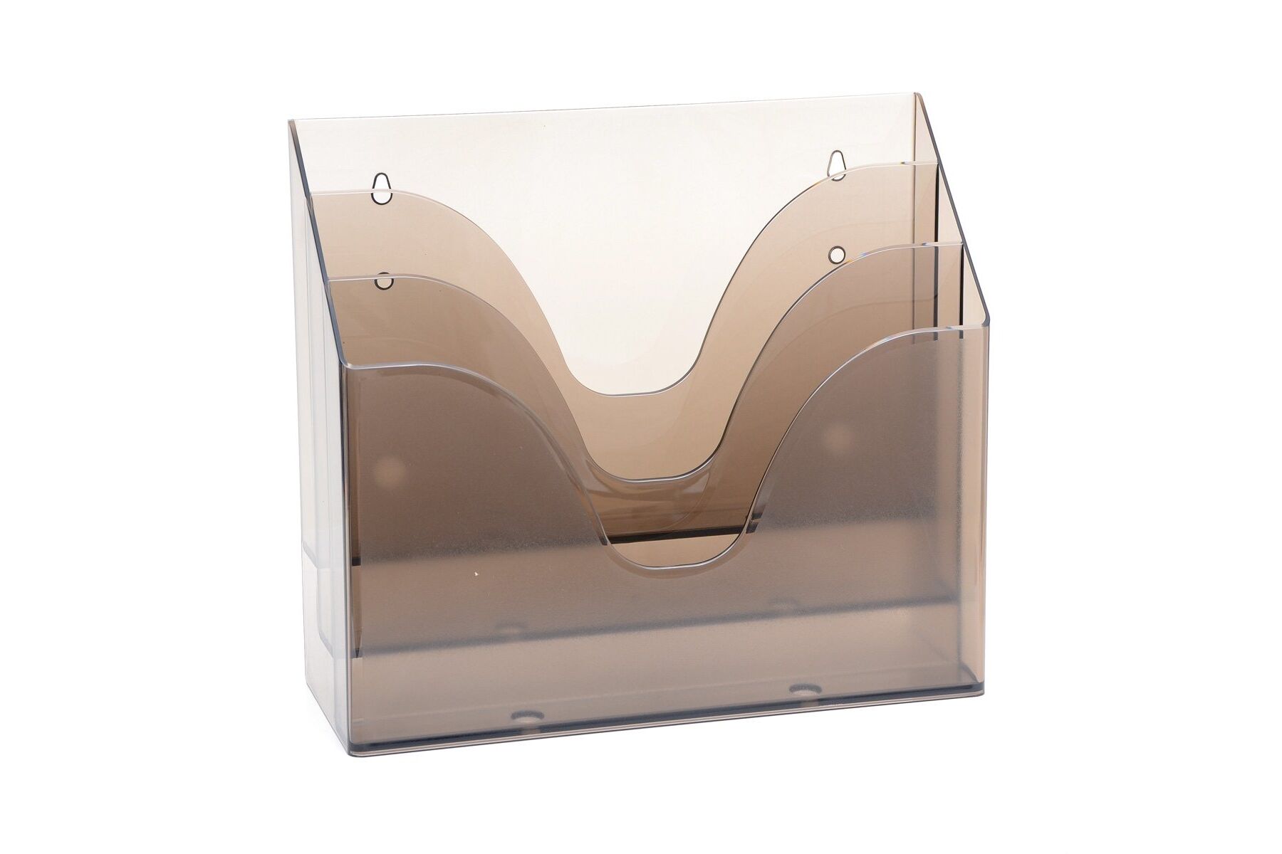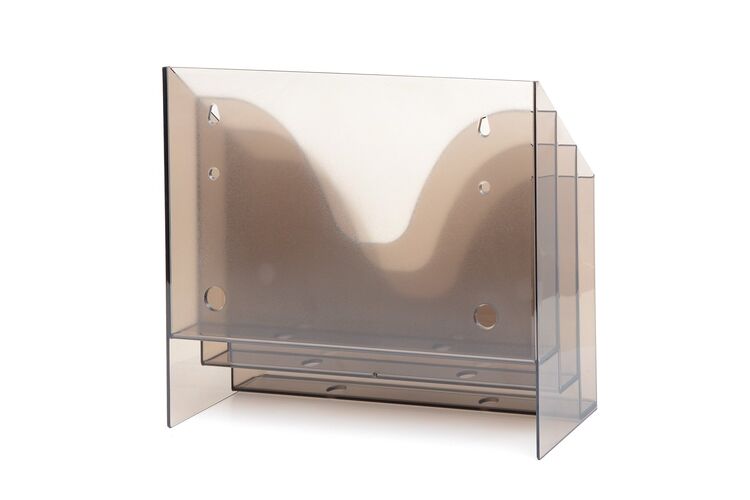 Descrição: Podendo ser utilizado tanto fixado na parede, como na horizontal ou vertical de alguma superfície, são ideais para organização de documentos, pastas, etc. Pode ser usado também como suporte para monitor. Especificações: Material: Fabricado em Poliestireno. Dimensões: 330 x 116 x 290 mm Cor: Fumê