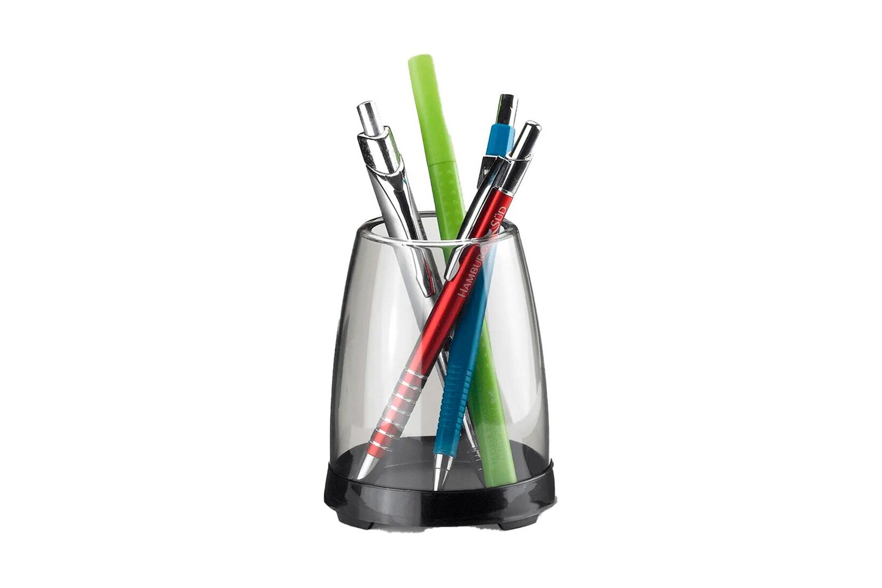 Produto desenvolvido especialmente para armazenamento de lápis e canetas, em formato arredondado, elegante e bem-acabado. Ideal para organizar sua mesa de escritório ou home office, pontos comerciais, expedições, escolas.Injetado em poliestireno. Dimensões: 9,6 x 7,9cm Cor: Fumê, com base plástica preta