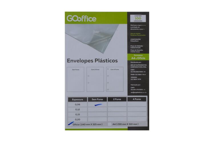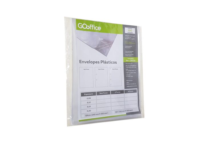 Descrição: O envelope plástico Go Office é ideal para proteção de documentos e papéis, podendo ser utilizado em pastas catálogos e fichários. Indicado para guardar pequenos objetos ou folhetos, sem que haja problemas de extravios e rasgos. Também indicado para proteger produtos que não podem entrar em contato com umidade ou poeira. Cor: Transparente Tamanho: Ofício 240x325mm Espessura em Micras: 0,06 m Furos: Sem furos Quantidade: Pacote com 100 unidades