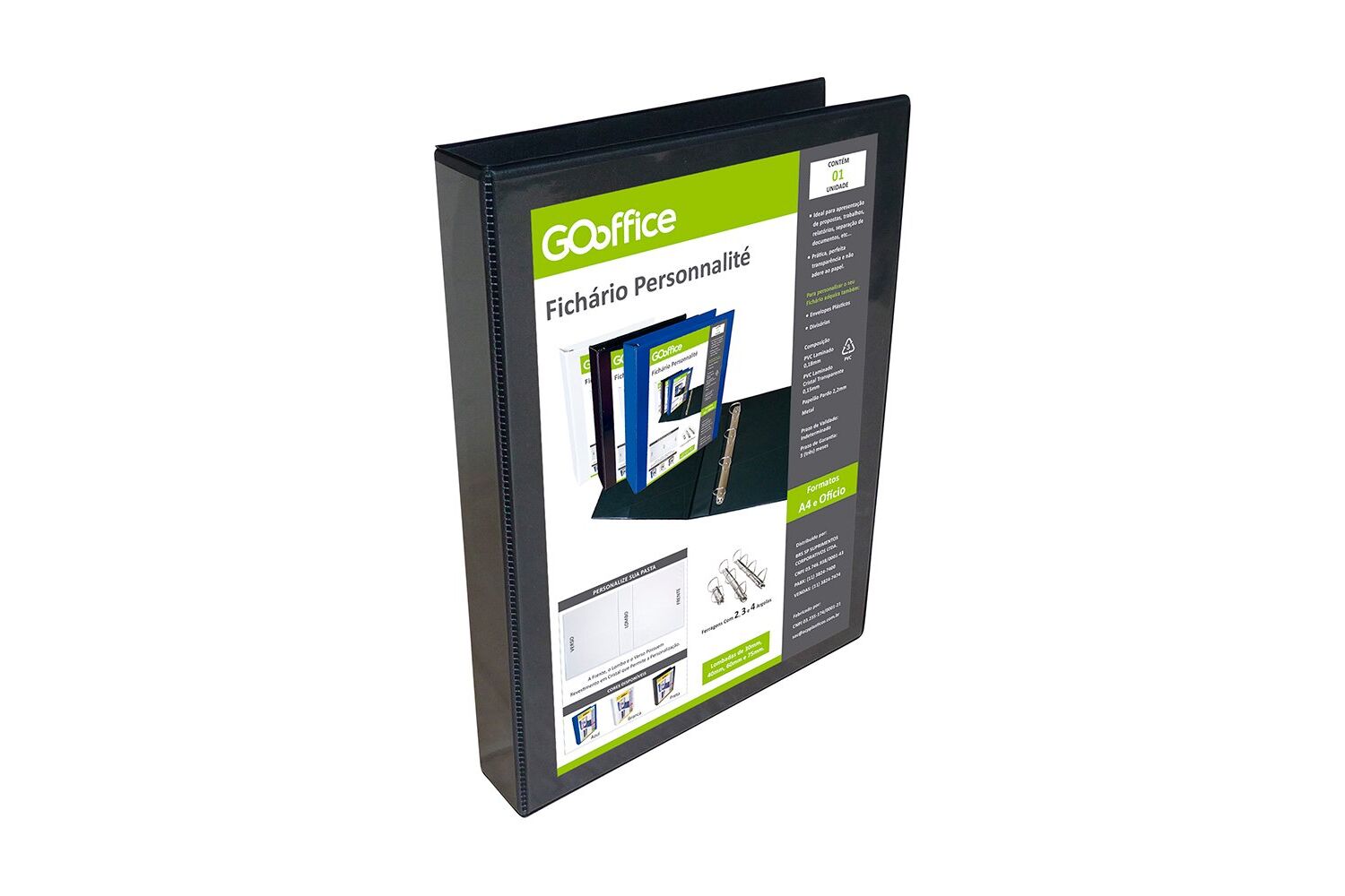 Pasta Fichário Go Office Personnalité, com 2 argolas e lombo de 75mm. A frente, o lombo e o verso possuem revestimento em Cristal, que permite a personalização. Especificação: Tamanho: A4 (265mm x 315mm x 75mm). Cor: Preto. Matéria Prima usada na Fabricação: Pvc, Metal, Papelão.