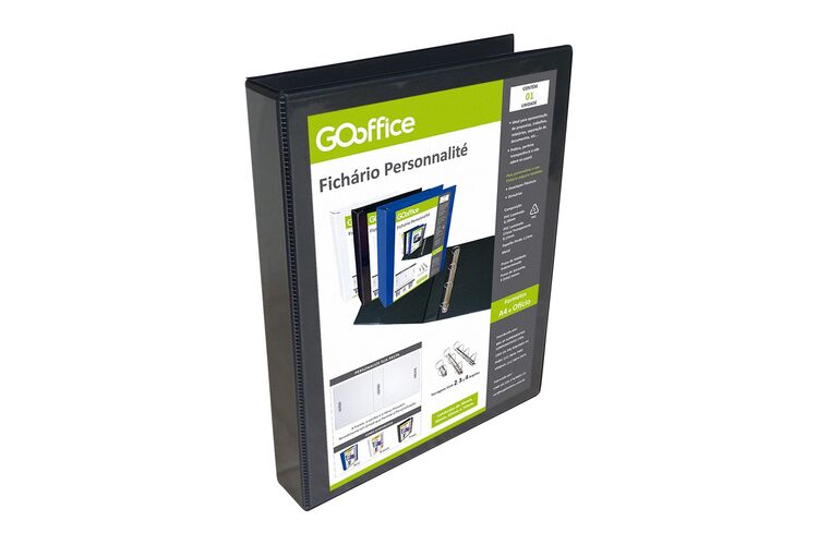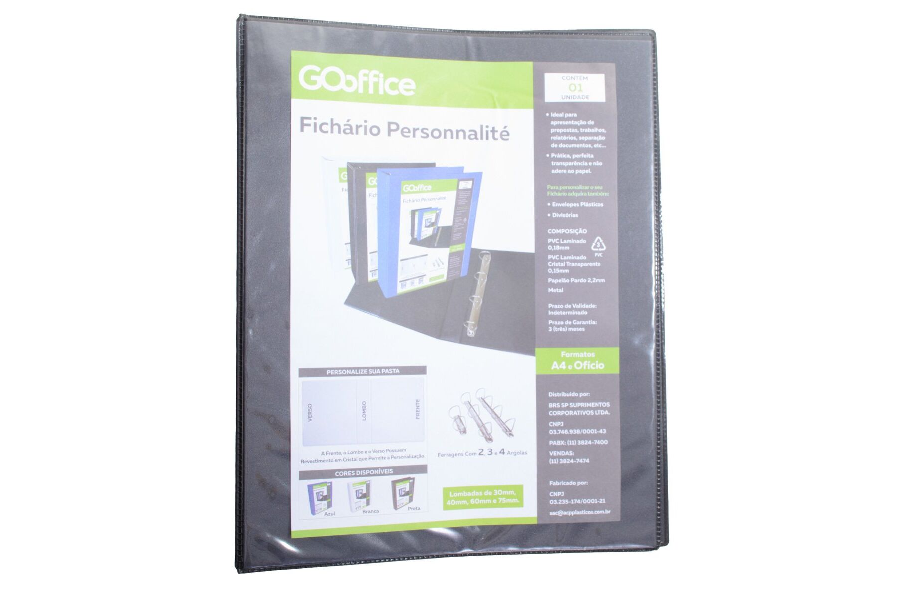 Descrição: Pasta Fichário Go Office Personnalité, com 4 argolas e lombo de 60mm. A frente, o lombo e o verso possuem revestimento em Cristal, que permite a personalização. Especificação: Tamanho: Ofício (265mm x 340mm x 60mm). Cor: Preto. Matéria Prima usada na Fabricação: Pvc, Metal, Papelão.