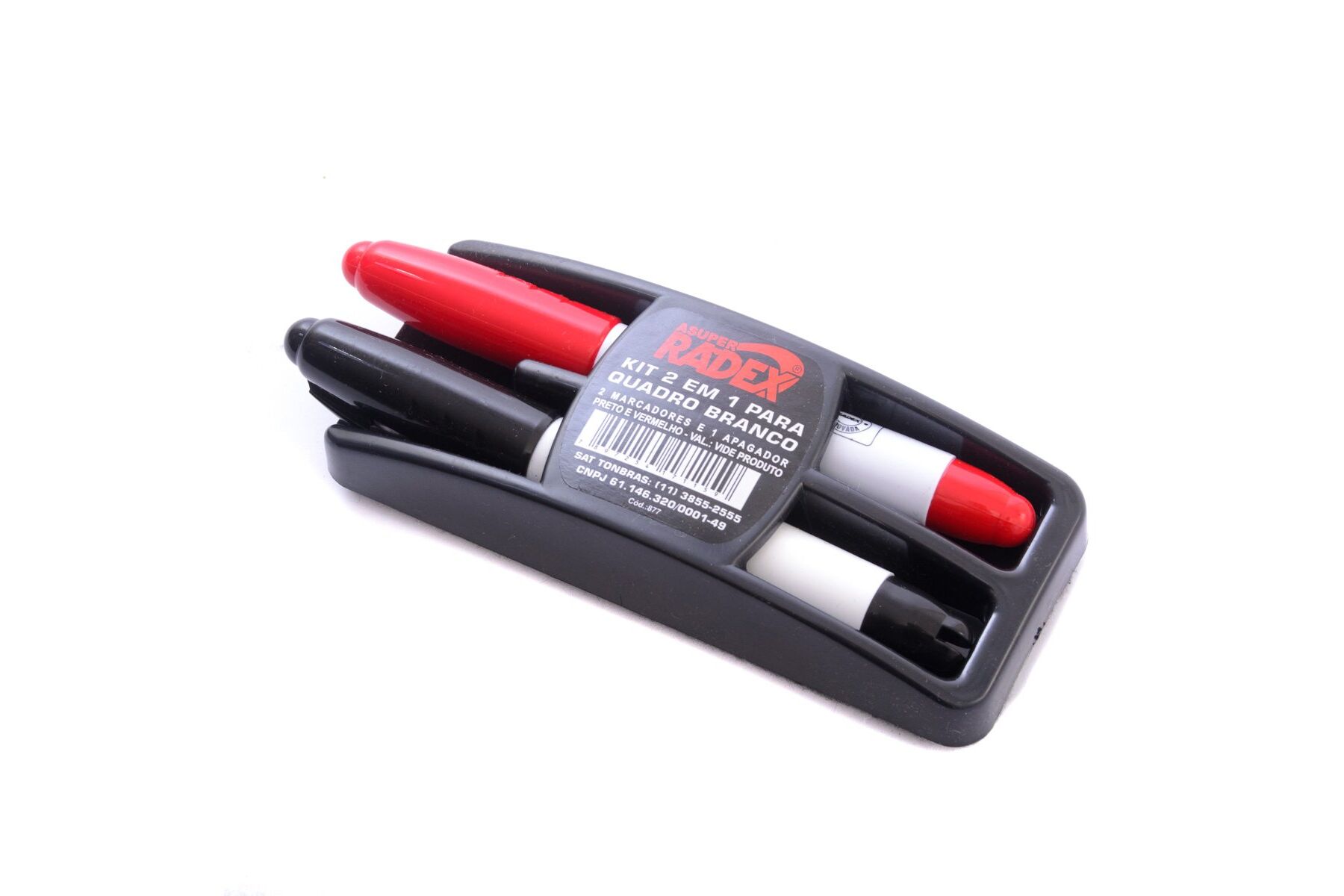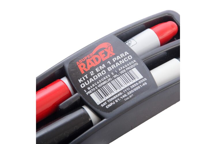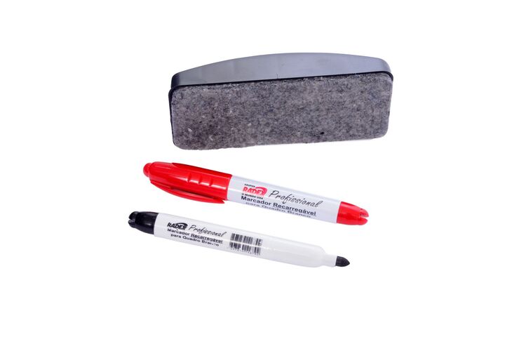 Kit apagador e pincel para quadro branco preto/vermelho O Apagador Radex tem feltro tratado, que garante ótimo deslizar sobre o quadro e uma apagabilidade eficiente e sem esforços. Formato anatômico e material á base de plástico ABS, tendo um corpo leve, resistente e rígido.