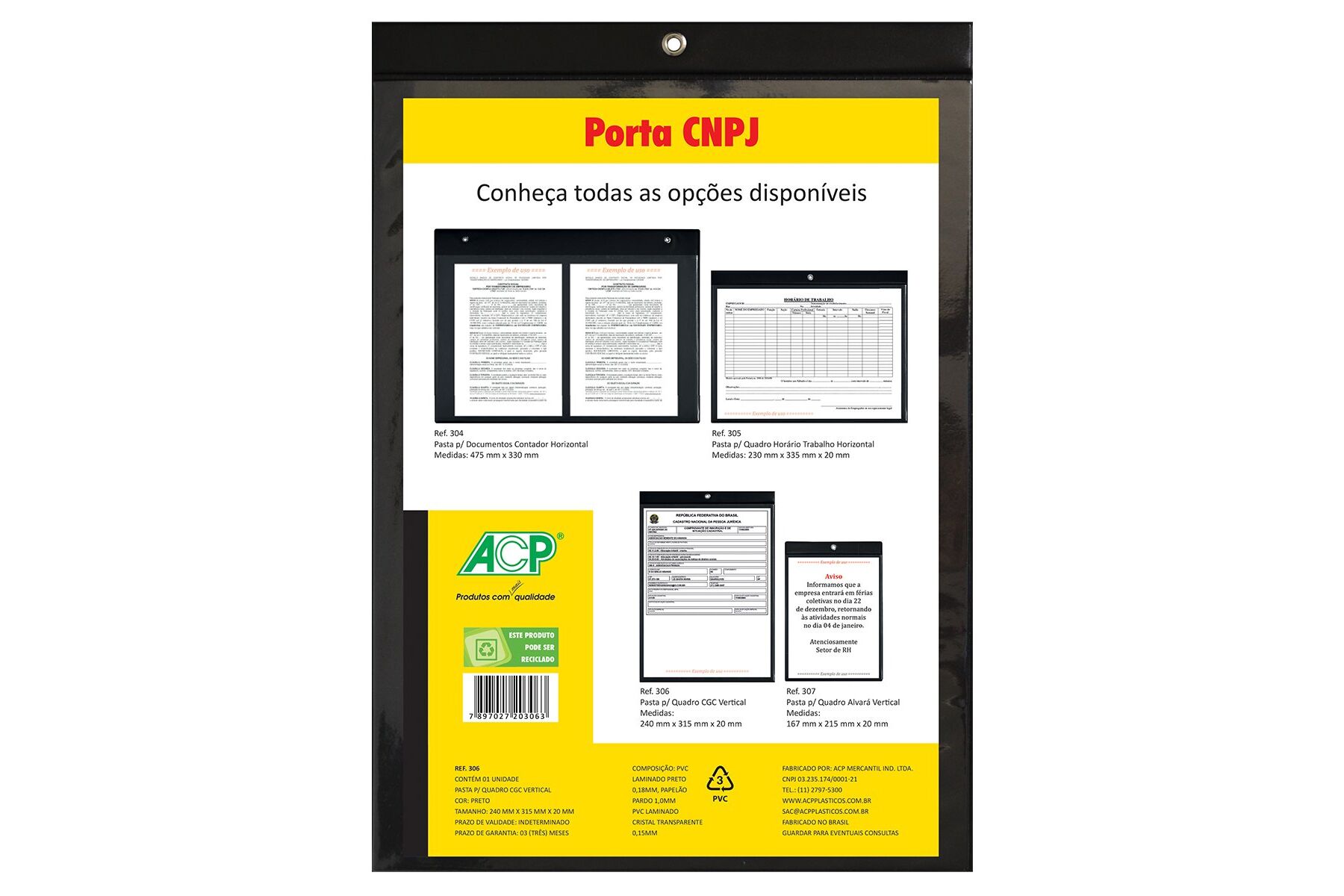Protetor para quadro CNPJ na vertical. Dimensões: 240mm x 315mm x 20mm Cor: Preta. Referência: 306. Composição: PVC, papelão.