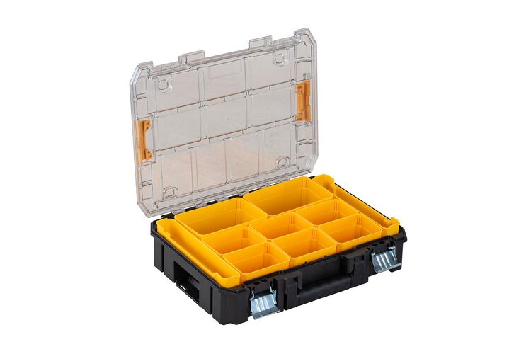 Caixa Organizadora de ferramentas TSTAK V com tampa transparente oferece uma nova inovação nas opções de armazenamento. Essa plataforma flexível permite diferentes combinações, todas as unidades podem se empilhar umas sobre as outras e podem se conectar com travas laterais duráveis para facilitar o transporte e o empilhamento seguro. Esta unidade possui compartimentos removíveis para peças pequenas e acessórios e, uma vez removida, permite espaço para ferramenta elétrica e carregador. Este organizador possui um design de tampa transparente e exclusivo, resistente a impactos, que trava todos os compartimentos no local com total visibilidade para acesso rápido. Possui uma alça larga integrada para portabilidade fácil e estável, além de dobradiças e trincas metálicas para serviços pesados. Capacidade de carga: 20Kg