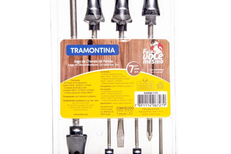 Quem quer estar preparado para realizar os pequenos trabalhos do lar precisa ter seu jogo de chaves de fenda Tramontina. Com chaves de ponta cruzada e fenda, apertar ou afrouxar parafusos fica muito mais fácil! Conteúdo do jogo: 1 Chave de fenda ponta chata 1/8x3" 1 Chave de fenda ponta chata 3/16x4" 1 Chave de fenda ponta chata 1/4x6" 1 Chave de fenda ponta cruzada 1/8x3" 1 Chave de fenda ponta cruzada 3/16x3" 1 Chave de fenda ponta cruzada 3/16x4" 1 Chave de fenda clipe 1/8x3"