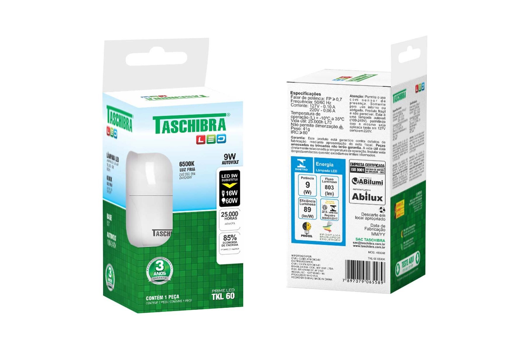 Descrição: Lâmpada Led Bulbo Taschibra 9Watts 6500K Branca Autovolt Ideal para iluminação residencial, a TKL 60 é equivalente à uma lâmpada de 60W incandescente ou 16W fluorescente. Sua luz fria de 6500K (Branca) entrega uma ótima reprodução de cores pois, seu IRC é > 80. Pode ser utilizada em qualquer posição, sua temperatura de operação é de -10°C a 35°C. Esta é uma lâmpada autovolt (100-240V), permitindo que a mesma seja aplicada tanto em 127V como em 220V. INMETRO 001405/2021