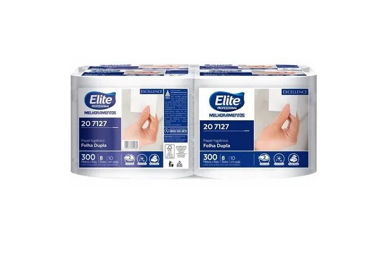 O papel higiênico rolo folha dupla Elite Melhoramentos tem como referência a maciez e o alto poder de absorção, produzido com 100% de celulose virgem e certificação FSC. O produto é comercializado em fardos plásticos com 8 rolos de 300 metros de comprimento e 10cm de largura cada . Produto compatível com os dispensers: