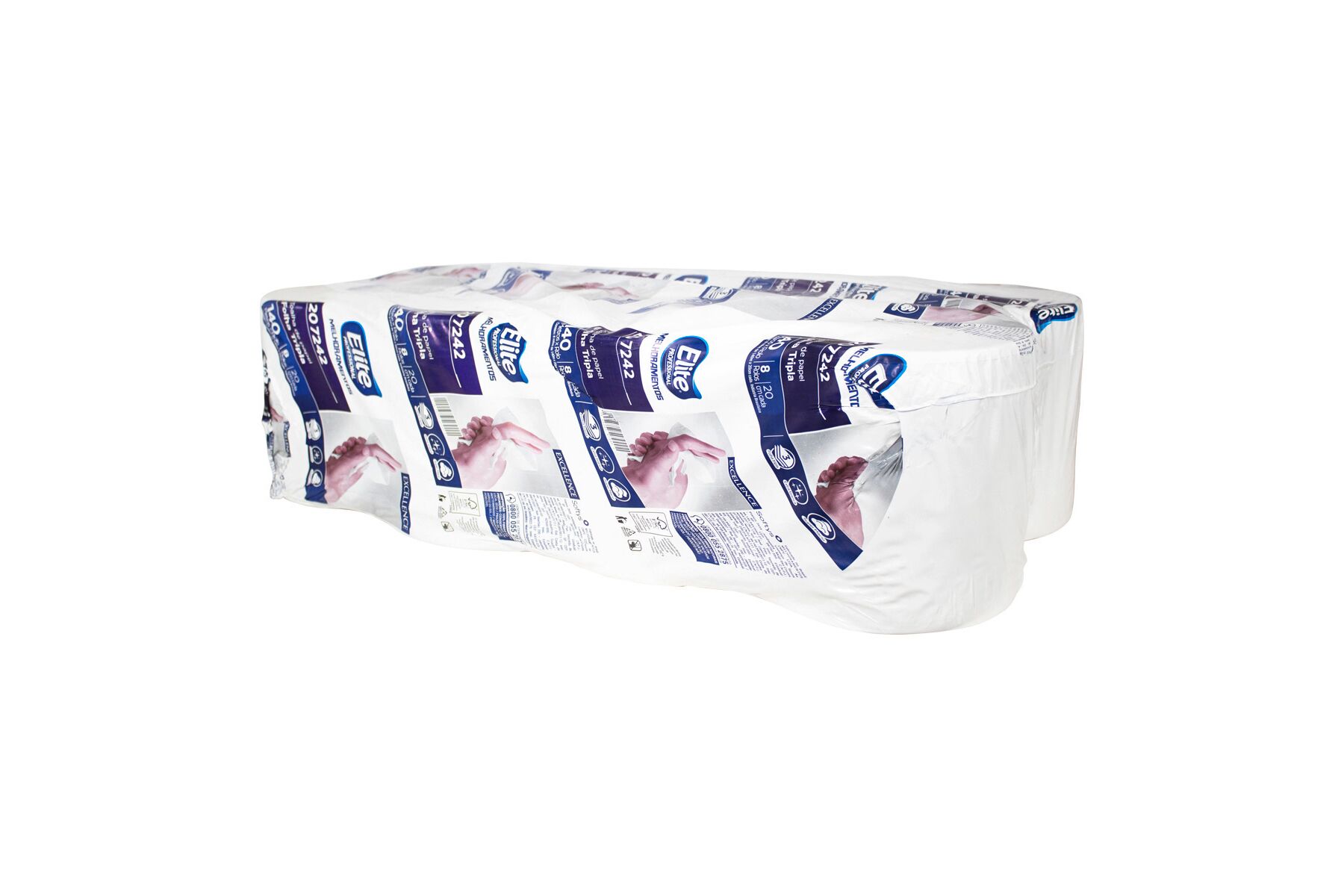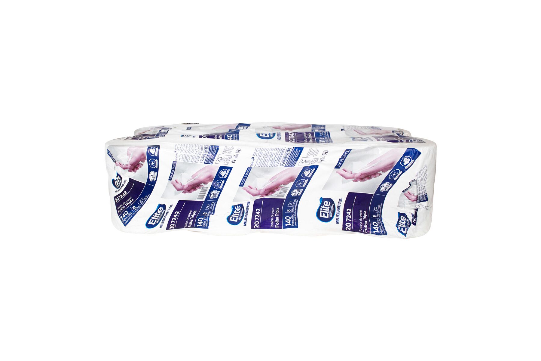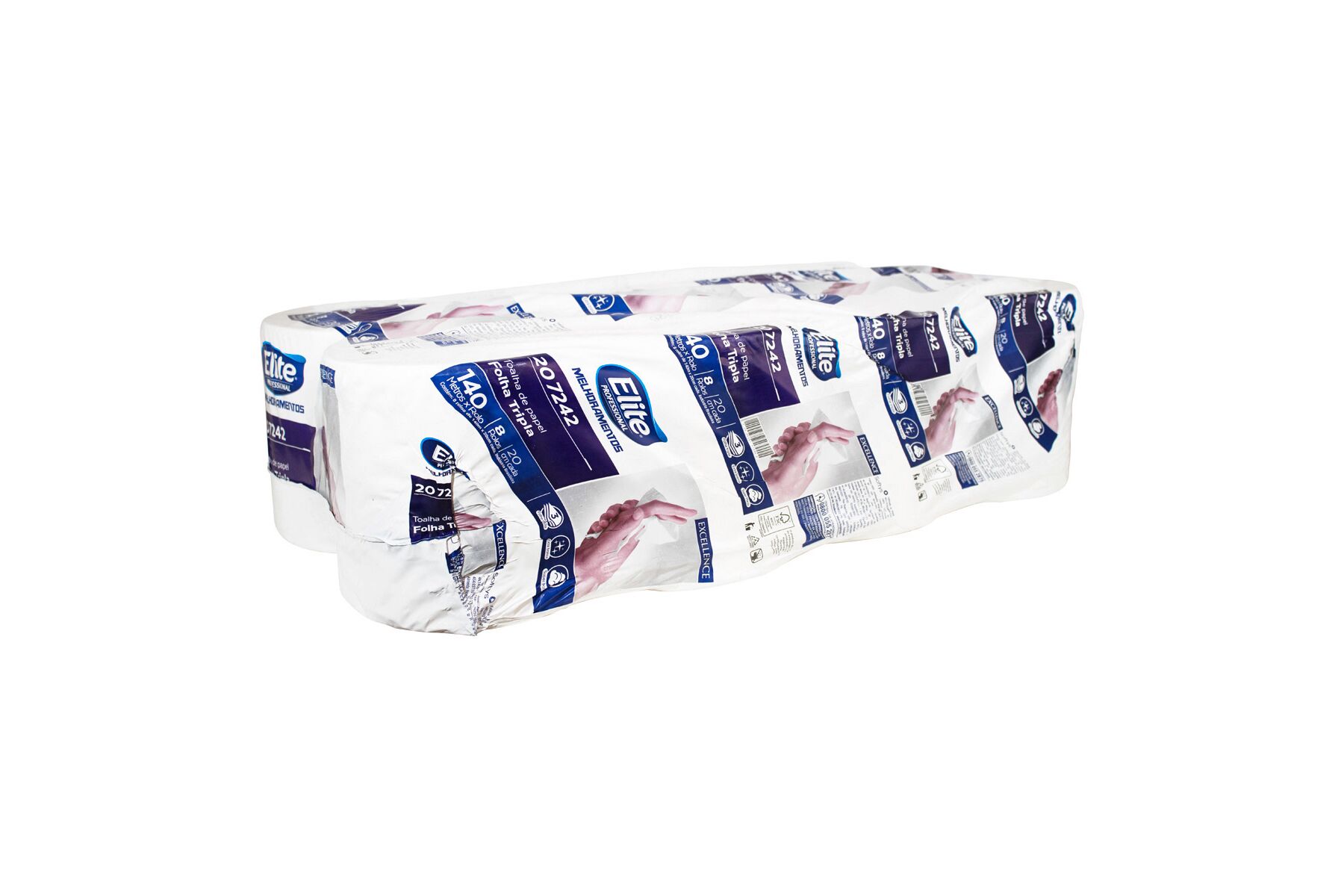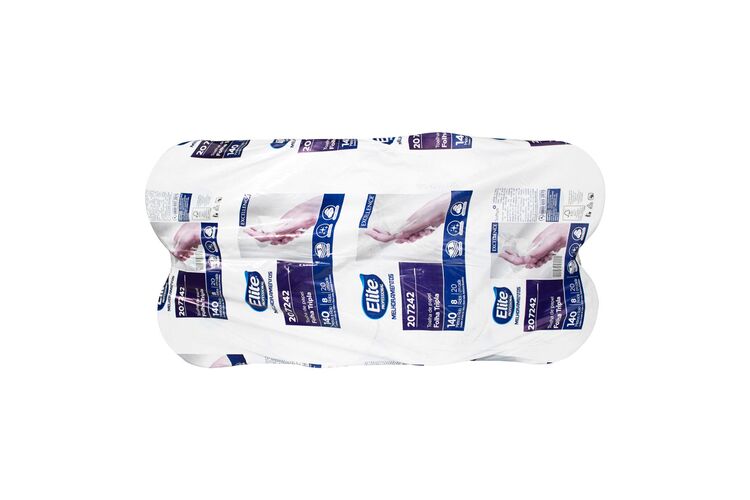 O papel toalha bobina Elite Melhoramentos folha tripla possui coloração extra branca. Foi desenvolvido para quem busca máxima eficiência em uso, trazendo satisfação aos usuários. Pode ser usado para secar as mãos em banheiros e cozinhas, limpezas superficiais e para absorção de líquidos em mesas e bancadas. Sua embalagem possui 8 rolos de 140 metros de comprimento e 19,1cm de largura. Uma folha é suficiente para total secagem das mãos, garantindo cerca de 3.900 secagens por fardo e trazendo assim, redução na logística de abastecimento. Por ser uma toalha descartável, evita o acúmulo de germes e a transmissão de bactérias e vírus nocivos à saúde. O produto possui o selo de qualidade ISO 9001 e selo de sustentabilidade FSC. Produto compatível com os dispensers: 043313
