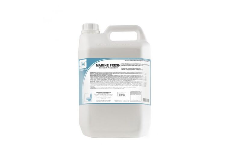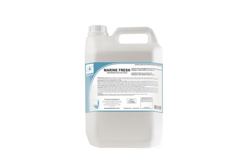 O Marine Fresh limpa e desinfeta em uma única operação. Não contém matérias-primas cáusticas, ácidas ou abrasivas, por essa razão não agride pisos cerâmicos, porcelanatos, sifões e encanamentos. Sua fragrância Algas Marinhas garante explosão de perfume e alta fixação. Além disso, possui ação comprovada frente às bactérias Staphylococcus Aureus e Salmonella Choleraesius, formulado com Quaternário de Amônio de 5ª Geração, garantindo sua ação bactericida em um amplo espectro de microrganismos, ação bacteriostática com efeito residual prolongado, maior eficiência em água dura e carga orgânica e menor irritabilidade dérmica. É um produto neutro destinado à limpeza, desinfecção de vasos sanitários, mictórios e qualquer tipo de superfície não porosa encontrada em banheiros. Marine Fresh não é ácido, cáustico, nem abrasivo, não ataca porcelana ou metais, nem danifica encanamentos e sifões. O Marine Fresh limpa e desinfeta em uma só operação, deixando uma agradável fragrância no ambiente! Limpeza Técnica     Especificações técnicas Aparência: Líquido transparente Odor: Marine Peso específico: 0,990 - 1,100 g/cm3 Teor de ativos: 3,50 - 5,50 % Ativo Bactericida: Cloreto de cocobenzilalquildimetil e 1- decaminum, N-decil-N, N-dimetil, cloreto: 0,35%. Registro do Ministério da Saúde: Produto registrado na ANVISA/MS sob n°3.0018.0142 . Limpador desinfetante de uso geral, indicado na limpeza e desinfecção de superfícies laváveis, tais como, pisos, azulejos, louças sanitárias, etc.   Diluição até 1:100   Instruções de uso Limpeza e desinfecção de vasos sanitários e mictórios:- Com o aplicador, remover a água do vaso sanitário empurrando-a pela saída do vaso. Pressionar o aplicador contra a parede lateral do vaso para remover o excesso de água. - Aplicar cerca de 50 ml de solução 1:5 de MARINE FRESH no aplicador.- Esfregar toda a superfície com o aplicador, principalmente sob a borda onde estão as saídas de água. Deixar o produto agir por 5 minutos.- Acionar a descarga várias vezes e enxaguar muito bem o aplicador.- Recomenda-se uma limpeza preliminar com BOWL CLEANSE em caso de sujeira muito pesada como incrustações.- Siga as instruções de uso do produto. Limpeza em pisos, azulejos, porcelanas e metais sanitários:- Diluir MARINE FRESH em água.- Recomendamos diluições máximas de até 1:100.- Aplicar a solução de MARINE FRESH com pano, mop, esponja ou spray.- Não é necessário enxaguar.- Para um trabalho de desinfecção geral, utilize MARINE FRESH diluído até 1:5.