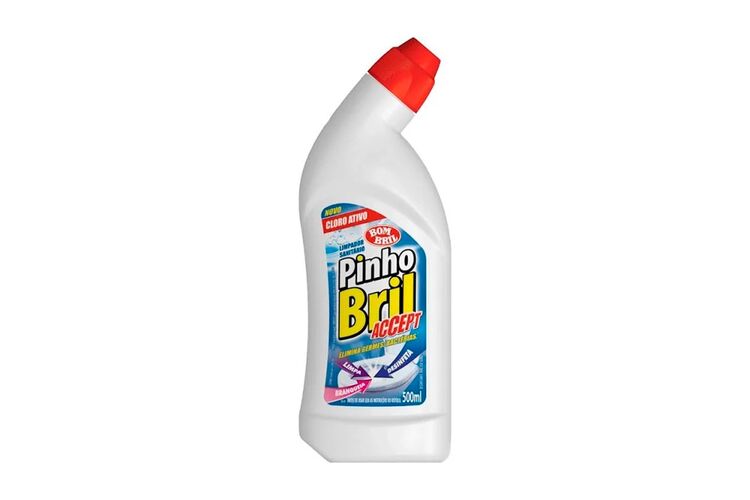 Limpador Pinho Bril Accept Sanitário Cloro Ativo 500ml Com o seu bico direcionado, o Limpador Sanitário Pinho Bril Accept facilita a limpeza em todos os cantos do vaso sanitário e desinfeta com eficiência, além de branquear as louças do banheiro. E, para completar, deixa um duradouro perfume. Dicas Incline o frasco direcionando o bico sob a borda interna do vaso sanitário e distribua o produto de maneira a formar uma película que cubra toda a sua volta. Deixe agir por, no mínimo, 10 minutos e dê a descarga. Atenção Produtos irritantes para os olhos, pele e mucosas.