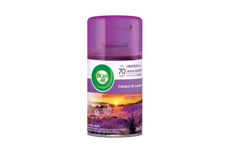 O Aromatizador Bom Ar Fresh Matic Aut. Refil 250ml Campos de Lavanda foi especialmente formulado com uma fragrância suave e agradável de rosas e romã, que age em poucos segundos, perfumando suavemente o ar da sua casa e criando um ambiente romântico e acolhedor. Com sua fórmula exclusiva, elimina rapidamente os odores desagradáveis dos ambientes. Este produto é um refil para o aparelho Air Wick Freshmatic, que libera automaticamente a fragrância em intervalos regulares para manter o ambiente sempre perfumado.