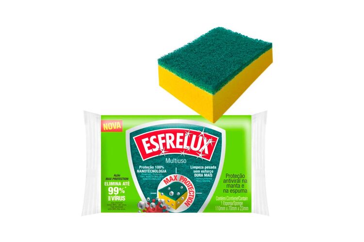 Esponja Esfrelux Lava Louças Anti Bactéria Esponja multiuso, nova formulação. Possui maior poder de limpeza com a manta abrasiva mais macia. Qualidade superior, dura mais. Limpeza pesada sem esforço. Proteção 100% nanotecnologia, com íons de prata que elimina até 99% dos vírus. Proteção na manta e na espuma. Esponja ideal para a limpeza de panelas, frigideiras, pisos e azulejos, além de superfícies delicadas, como: louças, vidros, copos e talheres. Produto atóxico. Validade indeterminada. Composição: espuma de poliuretano e fibra sintética. Sistema de qualidade Santa Maria.