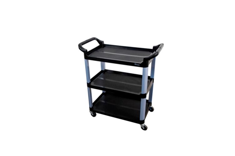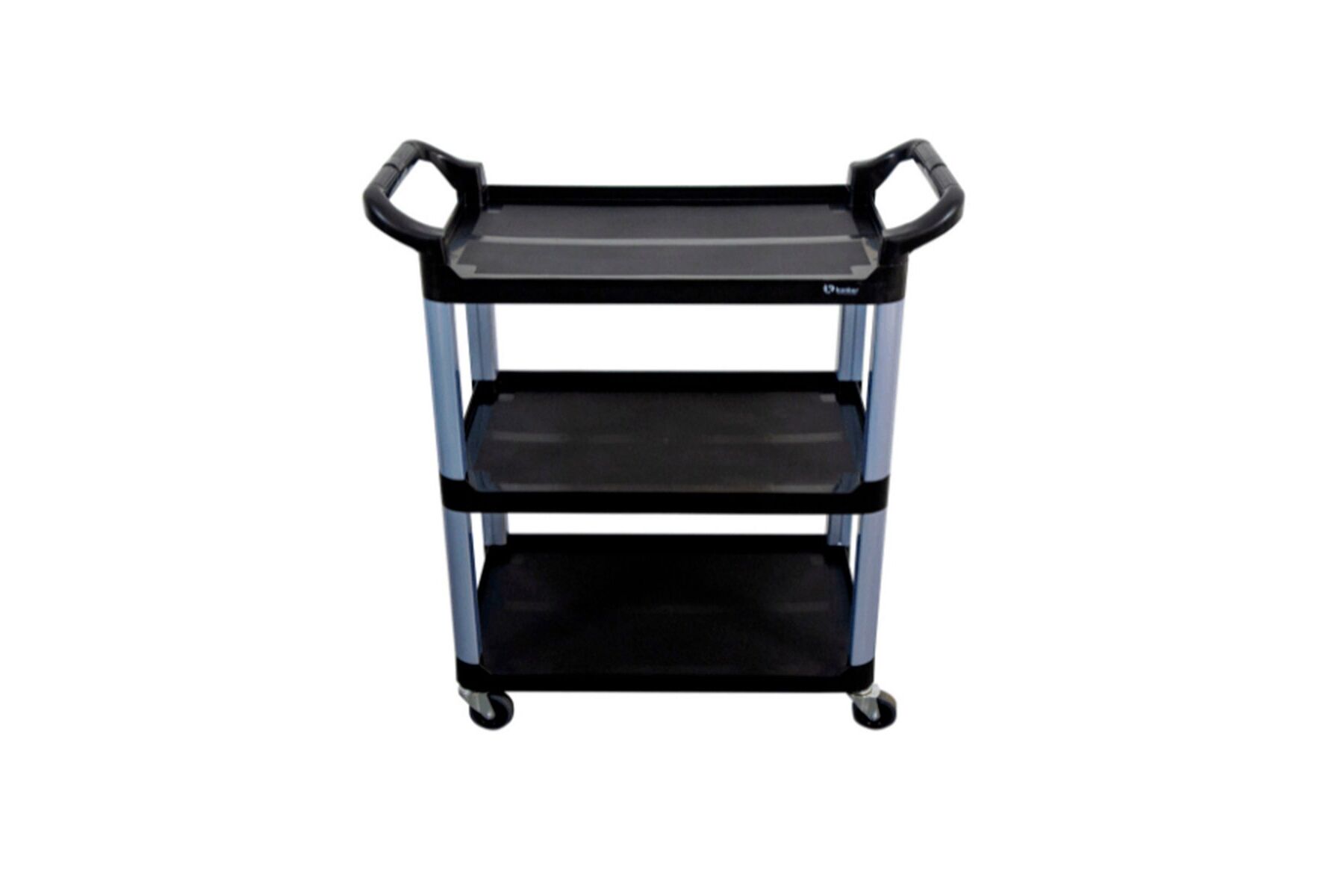 Carro Bandeja Serviço Kunber 3 Prateleiras Preto O Carro Kunber é um carro bandeja produzido com colunas em aço e prateleiras em polipropileno preto Rodas 4 polegadas (10cm) em aço (parte interna) e composto de PVC (revestimento) é extremamente resistente e versátil. Dimensões Montado: Comprimento: 84cm: Largura: 42cm: Altura: 90cm: Peso: 8,5kg Características: Carro de serviço permite agilidade e eficiência na coleta de materiais e rotina diária. Colunas em alumínio trazem resistência, são leves e proporcionam maior durabilidade. Capacidade de armazenagem de 35 Kg por prateleira – 105 Kg no total. Rodas 10cm (4pol) são adequadas a movimentação e capacidade de carga.