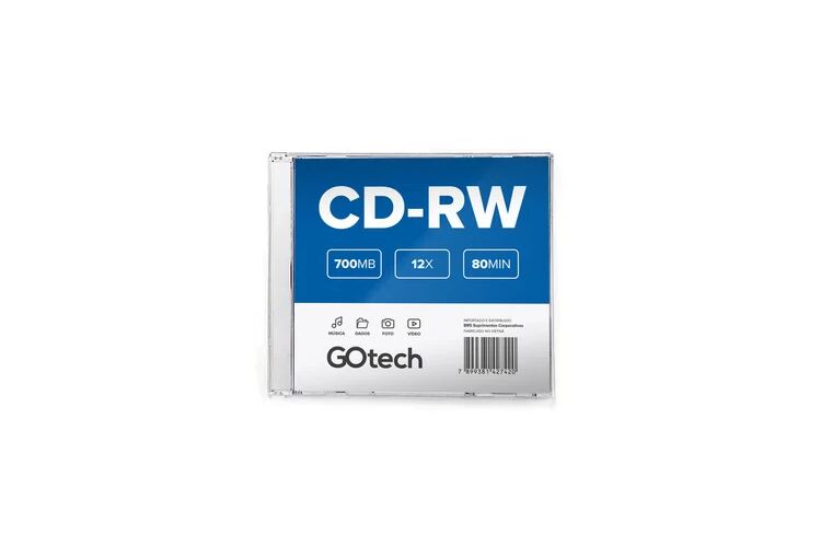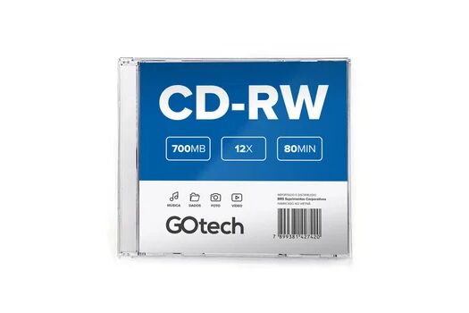 As mídias Go Tech foram projetadas com um alto padrão de qualidade para armazenar vídeos, fotos e arquivos. Gravação e reprodução em velocidade até 52X. Gravam até 700MB/80 minutos de informação quando utilizados com o drive gravável compatível CD-RW (Regravável).