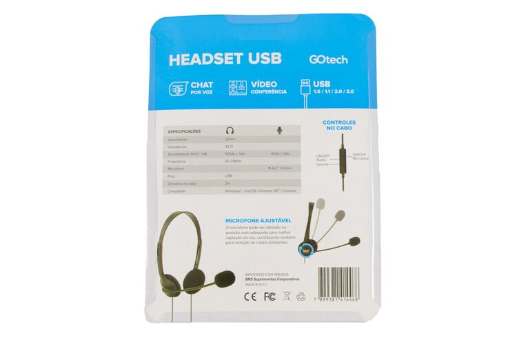 Descrição: Headset Go Tech com conector USB, utilizado em qualquer aparelho com entrada compatível por um ótimo custo-benefício , ideal para chat por voz e vídeo conferências. O microfone pode ser utilizado na posição mais adequada para melhor captação de voz, contribuindo também para redução de ruídos no ambiente. Controle liga e desliga e volume diretamente no cabo, facilitando e agilizando as chamadas. Cabo com 2 metros de comprimento, facilitando seu dia a dia. Características Técnicas: Dimensão dos fones 32mm Impedância 32 Ohms Frequência 20KHz Sensibilidade 105±3dB Plug USB Compatível com sistemas Windows Fones em espuma e ABS macio Microfone com haste flexível e cabo em PVC com 2 metros de comprimento Garantia 6 meses.