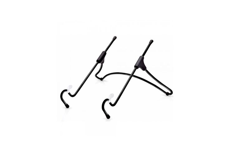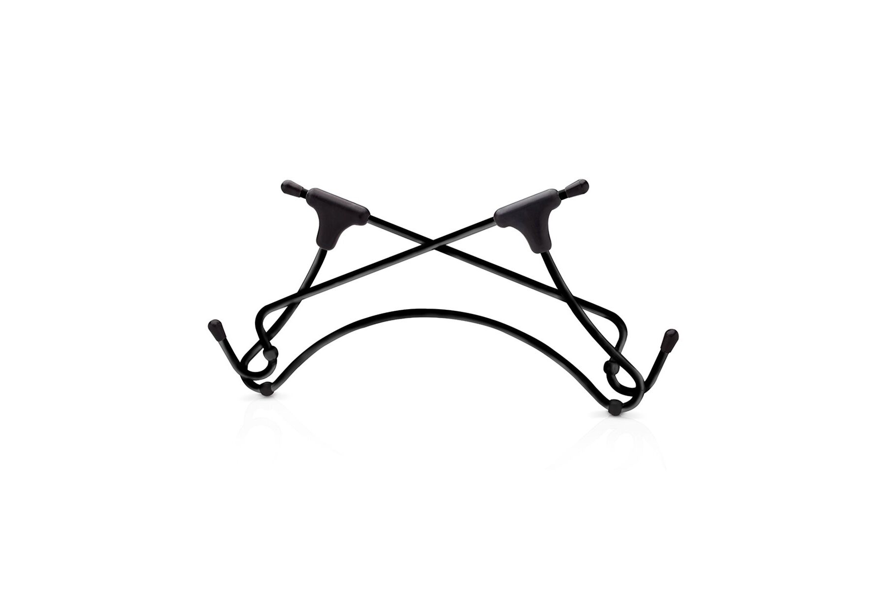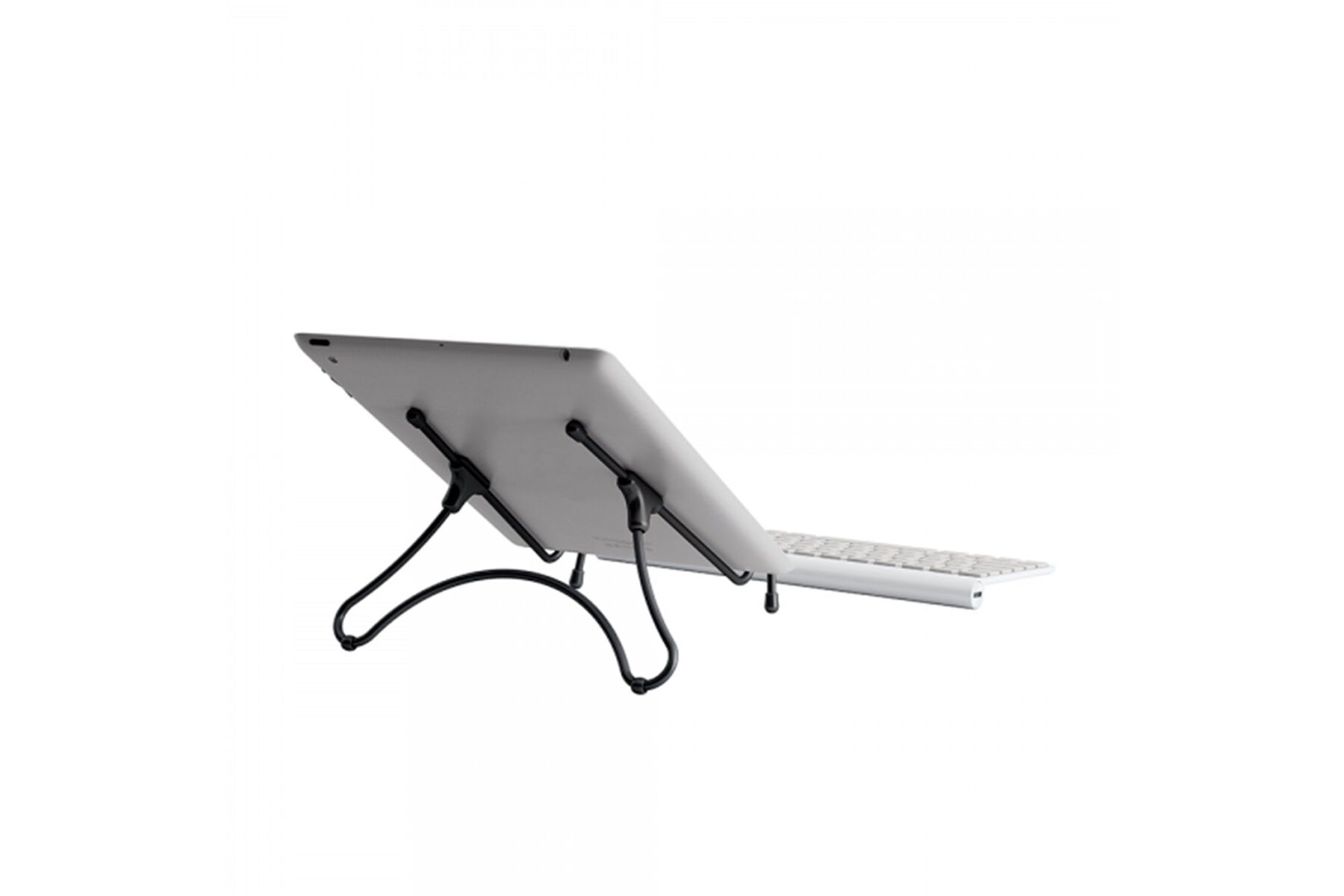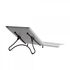 Feito em aço cromado, com acabamentos em plástico nos pontos de contato com o notebook. Sistema de inclinação e deslizamento feito por um polímero auto lubrificante.